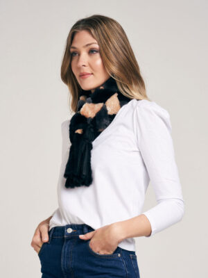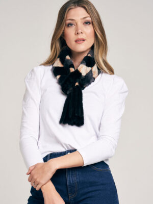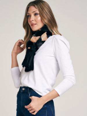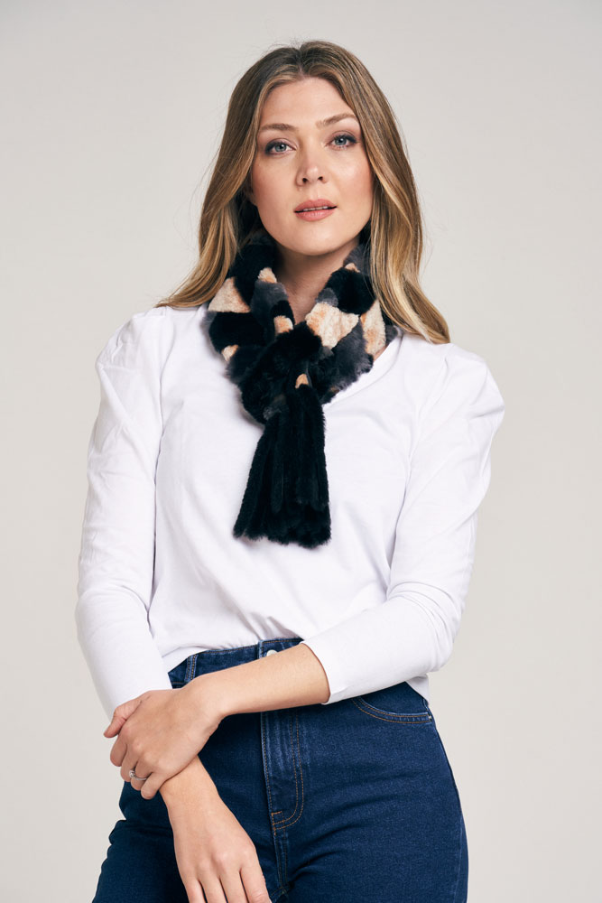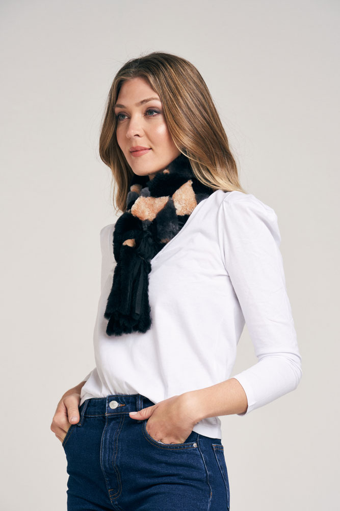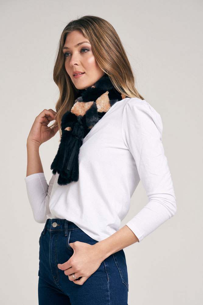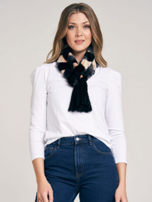 Bufanda de gamulan, tricolor con ojal pasante. Largo total 78 cm, ancho 10 cm. Terminada con flecos. Bifaz.