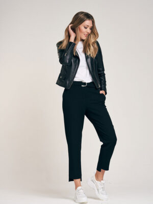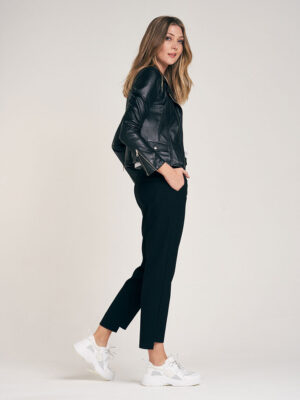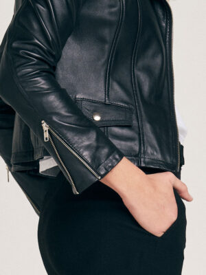 Campera de cuero de estilo casual, un modelo básico con cuello solapa, cierre al frente y en bolsillos.