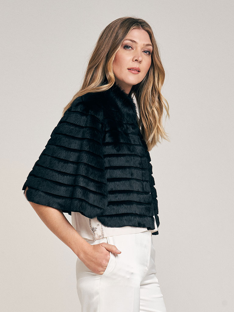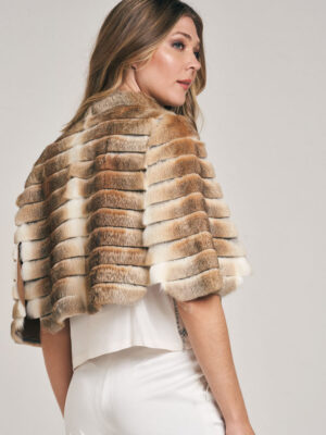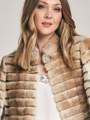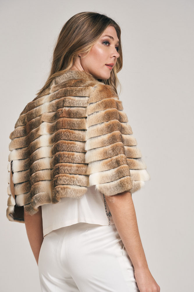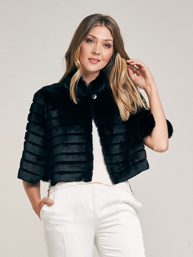 Capita de piel de conejo, trabajada en diseño lineal. Cuello Mao. Abrocha al frente con presilla y botón. Reversible, interior de cuero al tono con borde de piel. Largo total 43 cm. Regular fit.