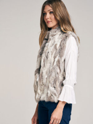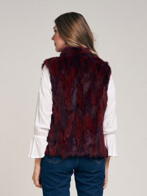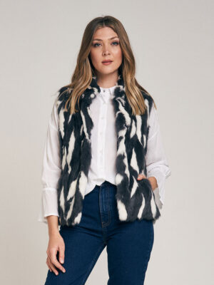 Chaleco de recortes de piel de conejo bicolor. Abrocha al frente con 4 ganchos peleteros. Cuello Mao, con bolsillo ojal. Forrado en satén. Largo total 58 cm. Calce regular fit.