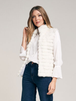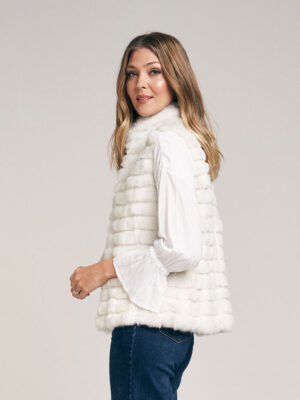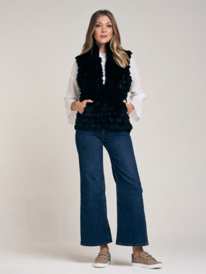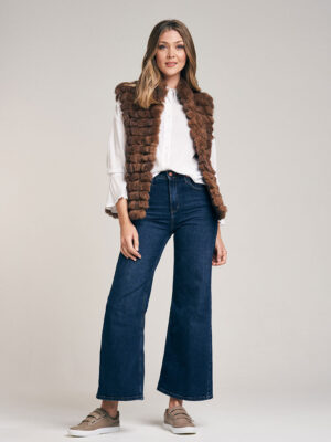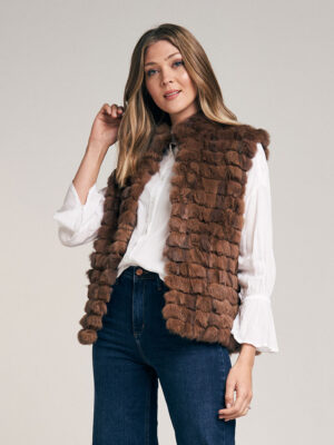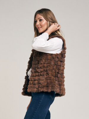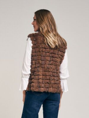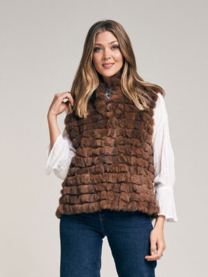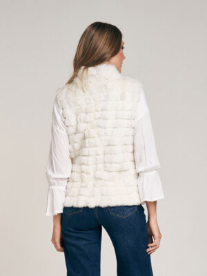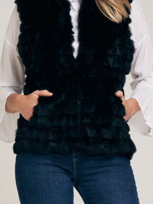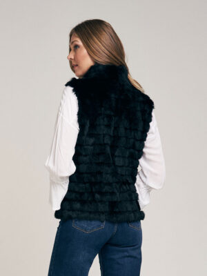 Chaleco de piel de conejo. Trabajado con cortes de pelo formando un diseño lineal. Cuello Mao. Abrocha al frente con 4 ganchos peleteros. Con bolsillo ojal. Forrado en satén. Largo total 59 cm. Calce regular fit.