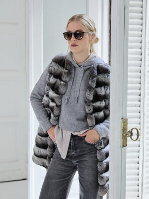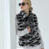 Chaleco de chinchillas, de aspecto suave y elegante, trabajadas en lonjas. Con escote a la base, abrocha al frente mediante ganchos peleteros.