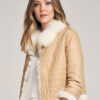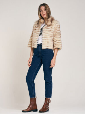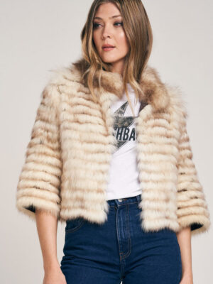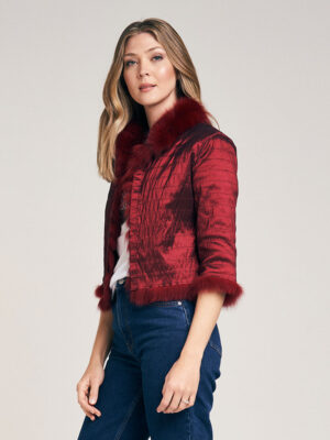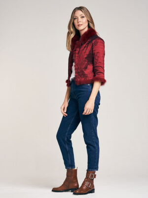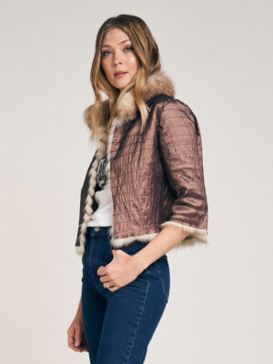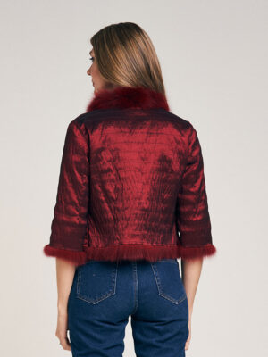 Chaqueta de taftán con pespuntes, mangas 3/4, cuello Mao de piel, bordes de vista, ruedo y manga de piel. Reversible en piel con diseño lineal. Abrocha al frente con 3 ganchos peleteros. Largo total 47 cm. Regular fit.