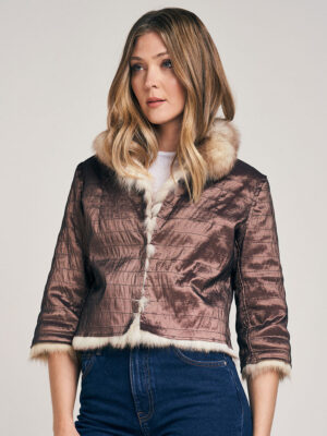 Chaqueta de taftán con pespuntes, mangas 3/4, cuello Mao de piel, bordes de vista, ruedo y manga de piel. Reversible en piel con diseño lineal. Abrocha al frente con 3 ganchos peleteros. Largo total 47 cm. Regular fit.