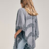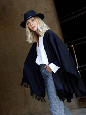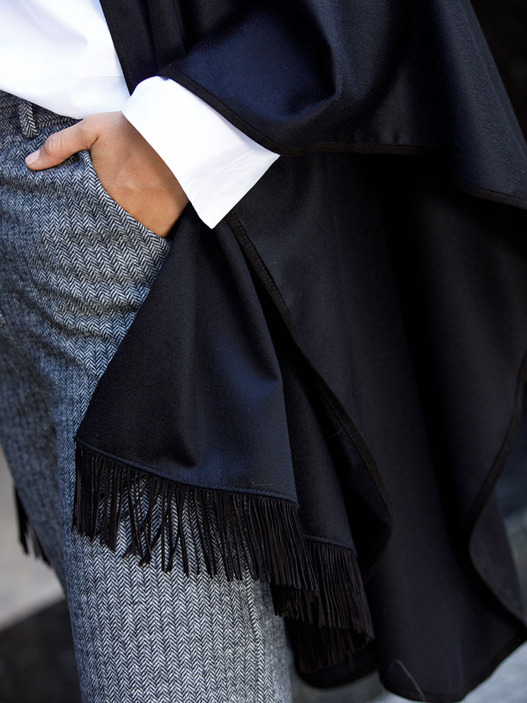 Poncho de cashemire italiano con vivo de gamuza en vistas. Ruedo con flecos de gamuza