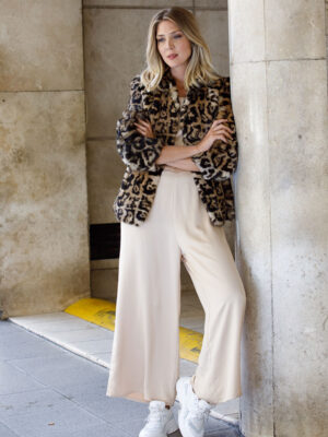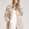 Saco de piel de conejo estampado, con cuello y solapa. Abrocha con ganchos y botón. Largo 66 cm