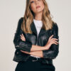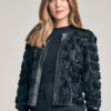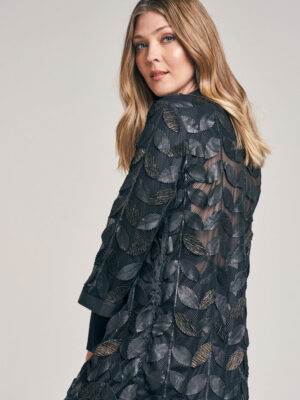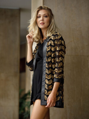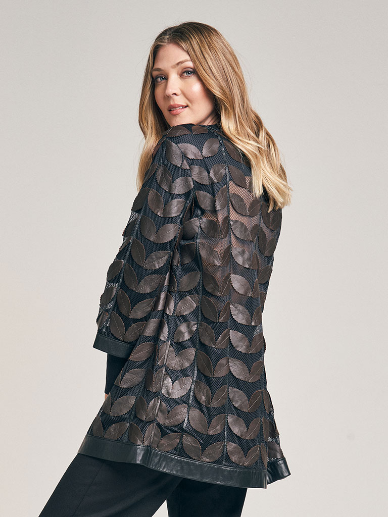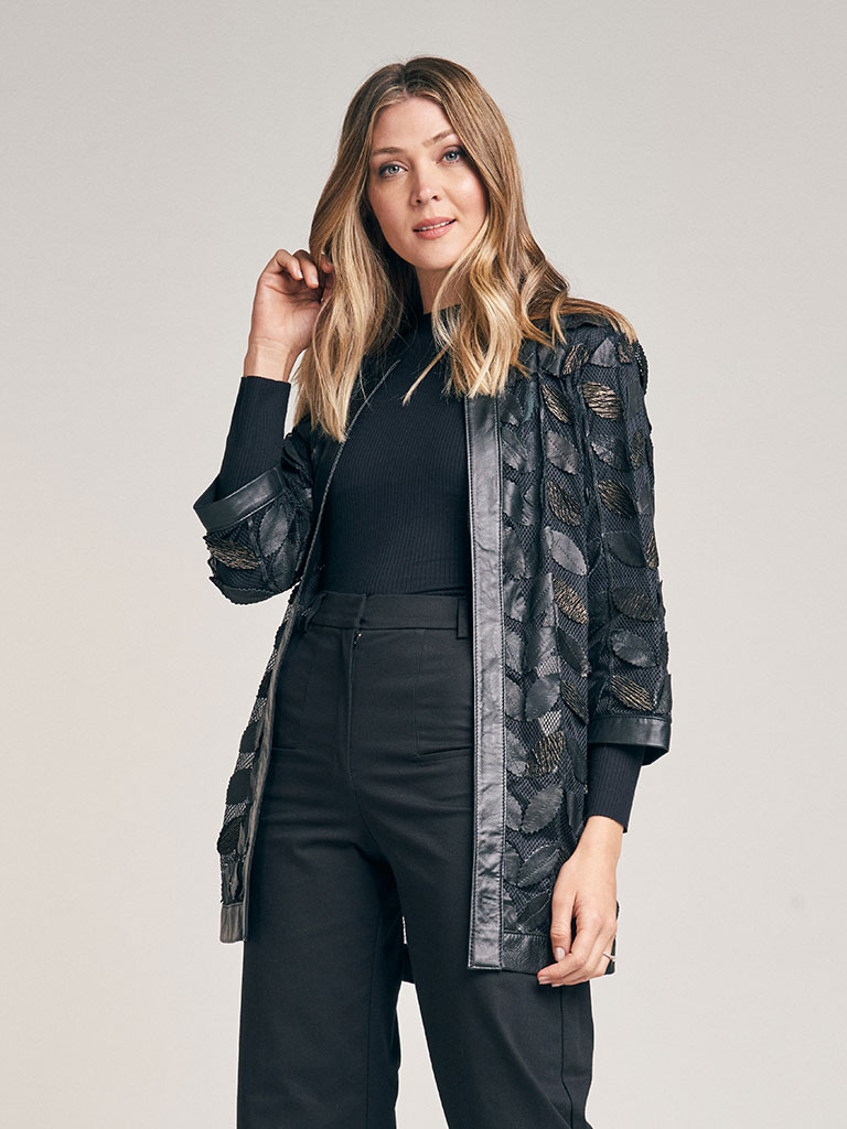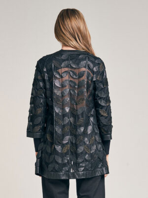 Tapado de red en color negro y diseño de hojas en cuero. Escote a la base envivado en cuero. Idem en ruedo vista y manga. No posee abotonadura. La base de red genera transparencia. Regular fit.
